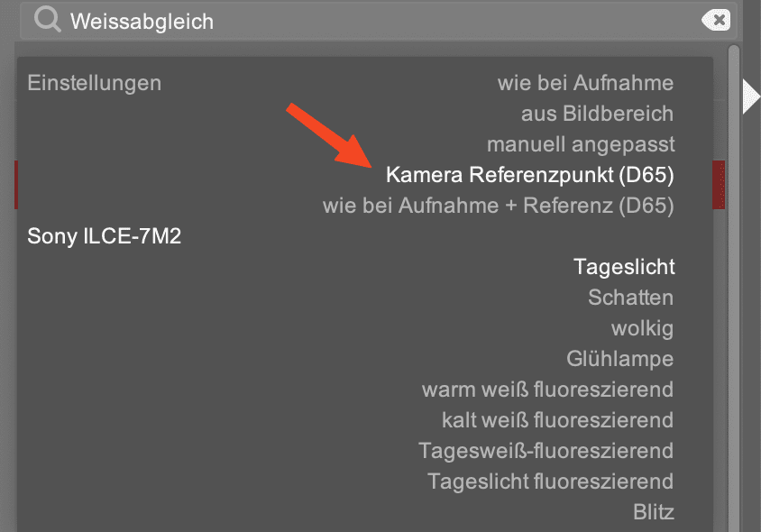 Erscheint die Meldung "Weissabgleich doppelt angewendet", kannst du das zum Beispiel auf "Kamera Referenzpunkt (D65)" zurückstellen.
